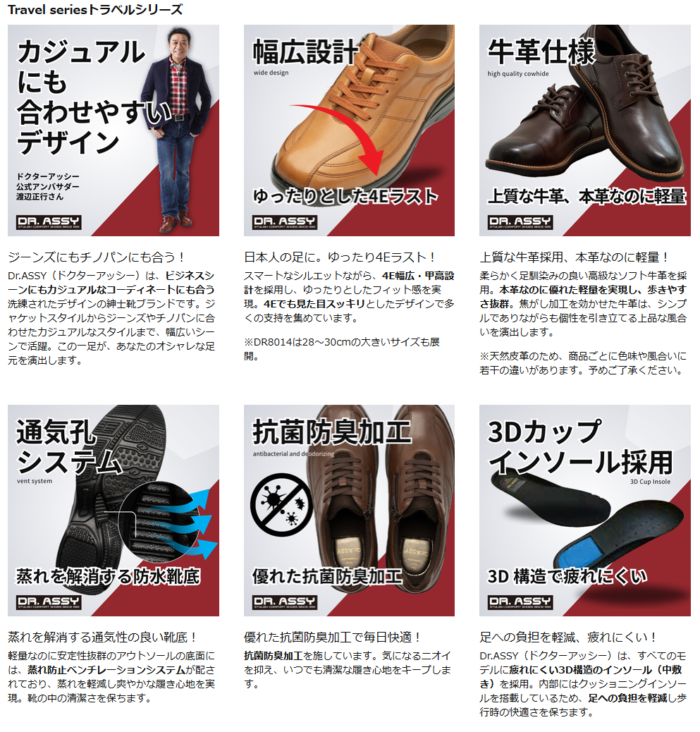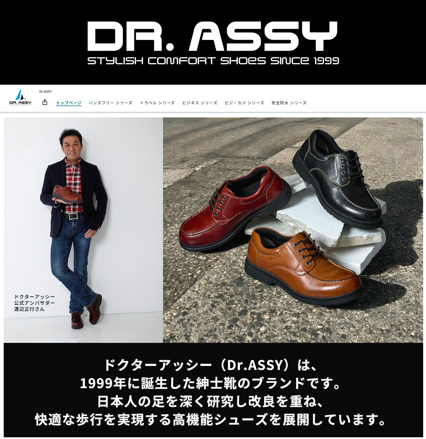 数十年にわたり、シューズ業界で大手ブランドのOEMを手がけてきた確かな実績とノウハウを持つ企業様です。革靴を中心に、高級紳士靴・婦人靴の企画・開発から輸入、卸売販売までを一貫して手がけ、渡辺正行さんをイメージキャラクターに起用した紳士靴ブランド「ドクターアッシー(Dr.ASSY)」は、今もなお多くの紳士に愛されています。